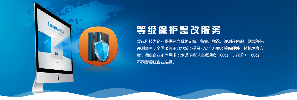 致遠等保服務全國不分地域,企業只需提供基本資料,其他事項均由我方一站式負責(定級、備案、技術文案、整改實施、等保評測等)。安全防護方案中,云安全方案或等保硬件一體機兩套方案任選,滿足大中小型企業不同需求。承諾不通過全額退款,為企業定制70分+,80分+,90分+不同套餐方案,滿足企業對安全防護的不同要求。