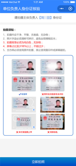 一般為對(duì)主體負(fù)責(zé)人身份證信息進(jìn)行識(shí)別及核驗(yàn)。備案人員需根據(jù)提示,進(jìn)行相關(guān)證件的拍照,電子化核驗(yàn)系統(tǒng)將自動(dòng)識(shí)別相關(guān)證照中的文字信息并對(duì)信息進(jìn)行真實(shí)性核驗(yàn)。 |