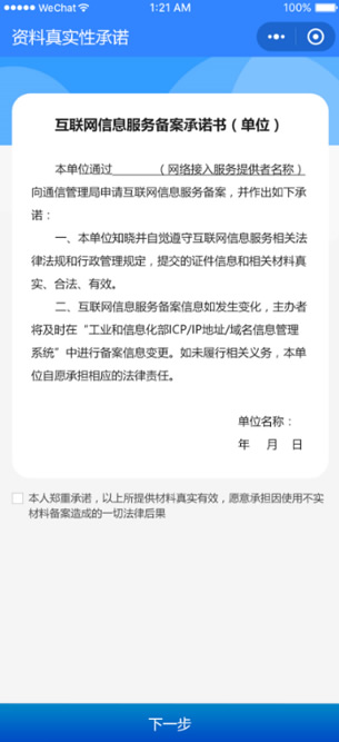 系統(tǒng)自動(dòng)生成《互聯(lián)網(wǎng)信息服務(wù)備案承諾書》相關(guān)內(nèi)容,備案人員需勾選確認(rèn)承諾按鈕,完成線上承諾工作。 |